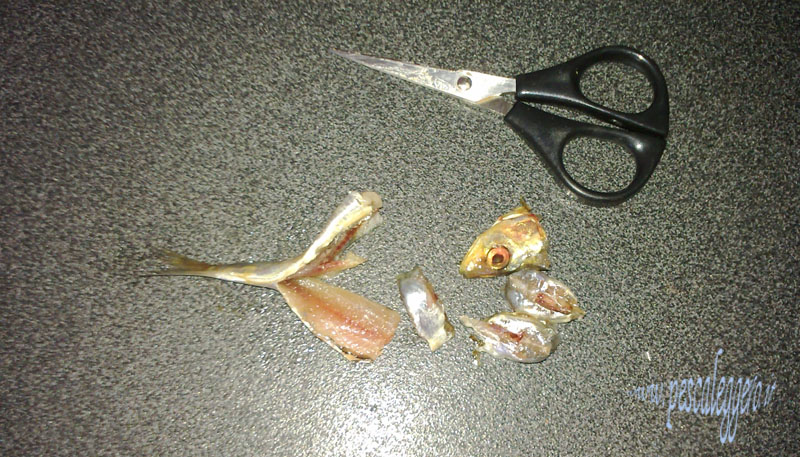 L'azione di pesca, prenderemo le nostre sardine e prepareremo una decina di trancetti come descritti seconda in foto, la testa e le interiora della nostra sardina la terremo per pasturare con pezzetti delle stesse dimensioni della nostra esca, poi li lanceremo proprio in prossimità del nostro galleggiante. Questa tecnica può dare ottimi risultati se praticata in prossimità della imbarcazioni usate per la pesca professionale. Le prede tipiche sono prima di tutto i cefali, ma come potete facilmente immaginare anche la regina può essere ingannata dal nostro pezzetto di sardina, proprio per questo le mangiate possono essere di tue tipi, se il tappo si muoverà in maniera lenta e non affonderà deciso saremo in presenza di cefali, che spesso riescono a rubare tutta la nostra sarda, invece se il tappo affonda in maniera decisa avremo sicuramente attaccato una bella spigola.