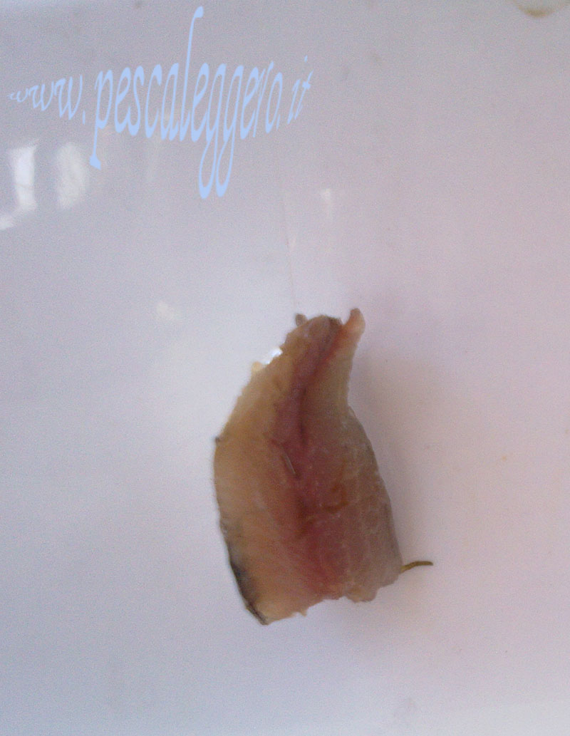Con una esca cosi avremo la possibilità di usare un bel amo (n°2 - n°4) anche con anello, la grandezza dipenderà dal sistema di misurazione della casa produttrice perciò una foto dell'innesco sarà il miglior modo per farvi capire, i filetti più appetitosi e che verranno attaccati con più voracità sono quelli senza lisca, e cuciti bene sull'amo, che deve arrivare ad avere la curva nella parte più bassa del filetto.