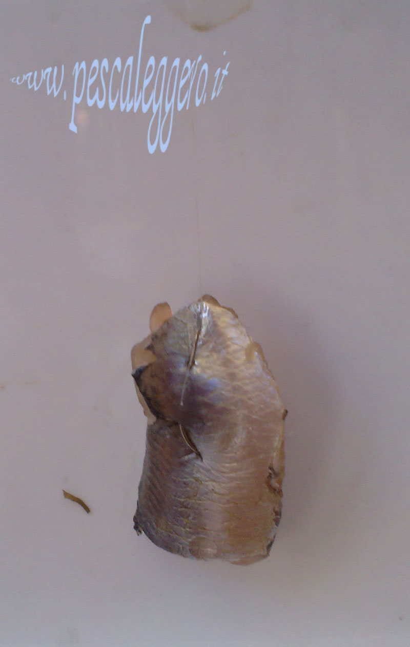 Questa è una tecnica Antica, e normalmente la vediamo mettere in pratica dai pescatori più esperti, quelli con i capelli tutti Bianchi, non è certo una pesca che si può definire leggera, anzi in molti casi viene fatta con la canna fissa in fenolico (fibra) e lenze di diametri che non danno possibilità alcuna al pesce se non la slamata. Descriviamo ora la nostra esca, la Sardina (Sardina pilchardus) è un pesce che Vive in branchi molto fitti, composti da centinaia o migliaia di individui, la sua carne è molto grassa, e ha il tipico odore forte del pesce azzurro.