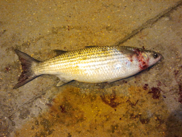 Finalmente prendo la fiondina e la poso vicino a me....devo dire che la corrente era talmente leggera che non è stato necessario fiondare se non in un solo momento quando è aumentata..... poi con il passare delle ore una stranezza, la corrente anche se andavamo in bassa è calava... determinando la riduzione del piombo.... Passa un altra mezz'oretta e provo un po di varianti, ma non si muove più niente, fino a quando il tappo parte in maniera repentina ferro istantaneamente ho la canna in mano.... neanche il tempo di alzare la canna e serrare la frizione che è a centro fiume.... riesco a stoppare il pesce il tappo è fuori dell'acqua, tira, ma penso sia più l'effetto della corrente..... viene verso la sponda e ad occhio e croce arriverebbe a metà della murata del rimorchiatore.... penso, lo devo togliere da li se non chi me lo coppa..... abbasso la canna e provo a portarlo verso di me.... mi segue e passa proprio a filo del rimorchiatore. ma punta la banchina è sotto non si vede fino a quando è proprio sulla banchina..... è un cefalo spropositato.....  il mio vicino di pesca lo coppa.... eccolo penso sia un pesce da un chilo e mezzo se non di più.......