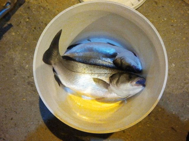 Giusto il tempo di slamarlo e lo vado a rilasciare sulla prua della barca a monte della mia postazione. Con calma controllo la lenza e l'amo per vedere se hanno riportato danni, ma tutto è apposto, innesco un bellissimo bigattino bello cicciotto e stendo la lenza.......per un po le cose sono calme, il mio compagno di pesca ferra una bella spigola sul chilo... mi alzo e la coppo.... passa un quarto d'ora e proprio su invito il tappo rimane sotto, sono sempre con la canna in mano... ferro è stoppata rimane sul fondo si muove poco ma la sento che da testate.... pochi secondi e comincia a perdere fondo e viene a galla la tengo li, non do filo si arrabbia tira.... concedo poco e viene galla, scoda e il mio compagno di pesca la coppa..... una bella regina sul chilo e mezzo.....  Ecco i pesciotti nel secchio....