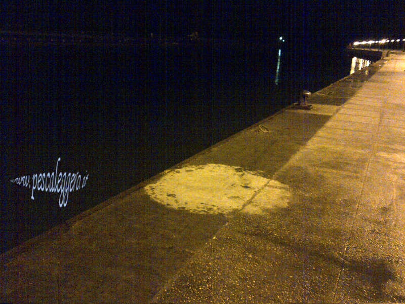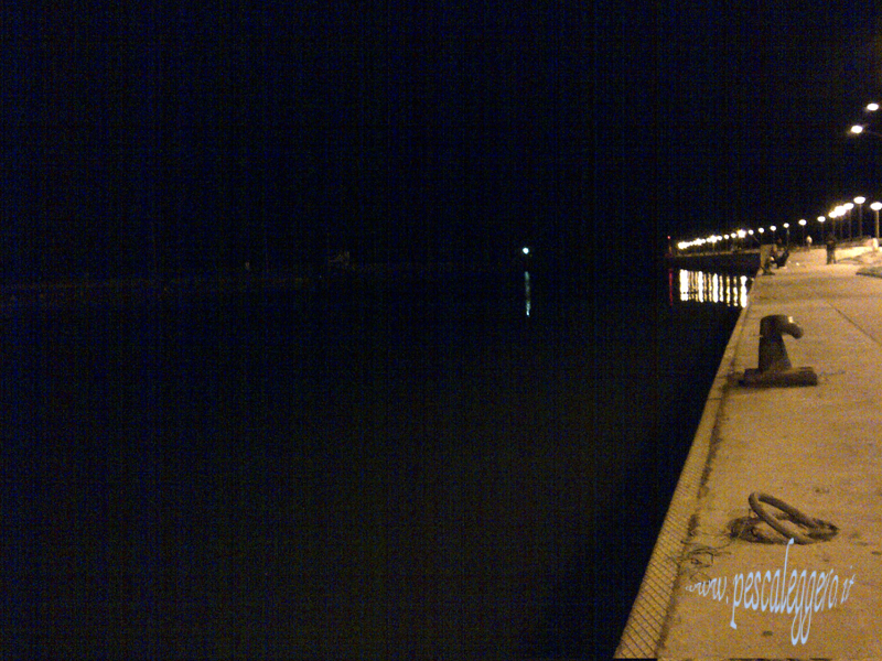 La pioggia diventa più forte, ma sotto l'ombrello sto bello bello..... la fionda mi aiuta a lanciare il bigos..... nel punto che reputo più opportuno per far arrivare la mia pastura vicino alla mia esca.... tutte sembra essere giusto.... ma il tappo sta li fermo........ c'è molta attività molti cefali saltano e si vedono molti movimenti a pelo d'acqua, è arrivata mezzanotte e mezza, nella mia mente chiamo il giro per l'una, non finisco questo pensiero e il tappo affonda poco.... riesce e riparte veloce...... ferro, questa volta non è la solita gnagnetta... sta sul fondo e sale molto lentamente.... parte verso dentro.....l'antiritorno aperto.... qualche metro di filo lo prende.....punta verso fuori....e sale prende aria e riparte sotto....viene contro la banchina.....ma le cose si stanno per concludere..... infatti a bocca aperta è a galla..... e finisce nel coppo.... la slamo.... la faccio cadere nel secchio, innesco e sono di nuovo in pesca, un altra oretta, non si vede più niente, il vento diventa più forte la pioggia fina fina...la stanchezza si comincia a far sentire, e piano piano chiudo tutto e torno a casa...... :) Il pesciotto ferma l'ago a 8 etti.... :)