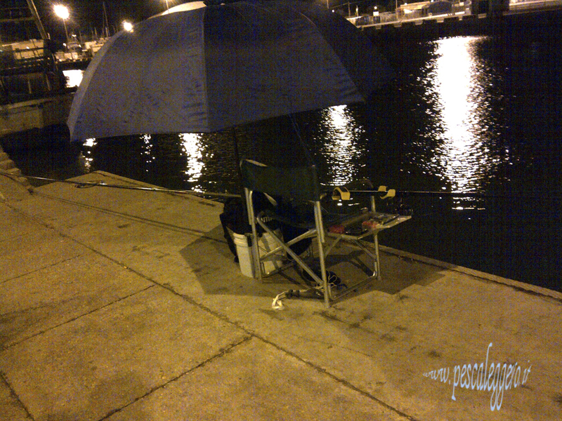 I minuti passano la corrente varia ma non di tanto, nella prime due ore non ho mai messo piombo in aggiunta al grammo della lenza, questa cosa non è il massimo, ma ho sperato tanto che magari durante le piccole variazioni di corrente qualcosa potesse smuovere l'attività dei pesci, il meteo mi fa lo scherzetto e comincia a piovere leggero leggero..... prendo l'ombrellone e lo metto in posizione riassetto l'attrezzatura in modo da tenere tutto all'asciutto, coem termino queste operazioni ..... la corrente di fondo è diventata più forte, il tappo tende ad affondare leggermente e .........è partito.......la mia ferrata è stata istantanea...... una bella spigolotta su i tre etti è arrivata nel coppo.... il tempo di slamarla è rilasciarla.....e sono di nuovo in pesca, la pioggia è leggera fortunatamente senza vento e rimango bello asciutto, ormai è sempre necessaria la felpa, la temperatura scende e meglio coprirsi e stare al calduccio.....