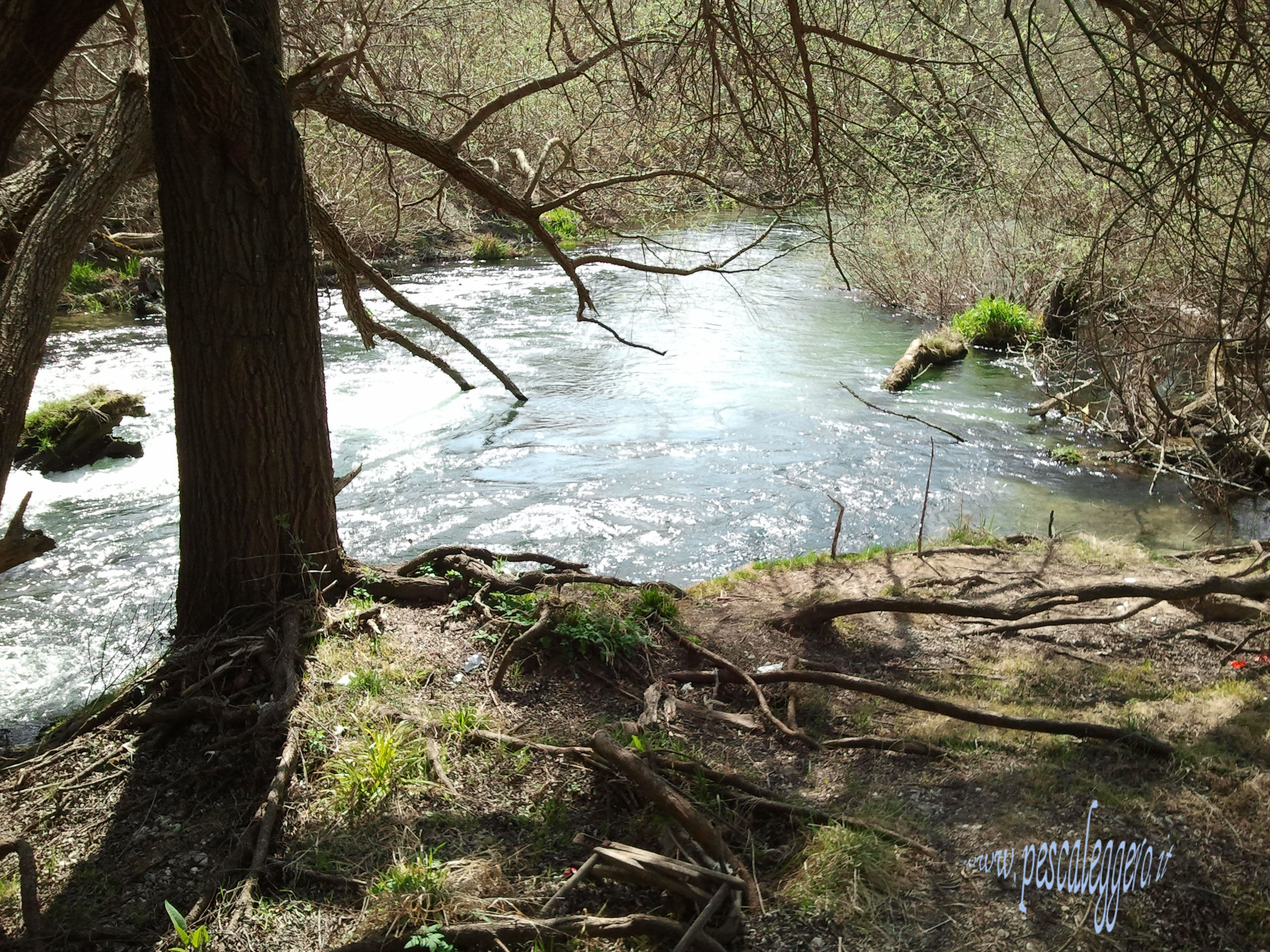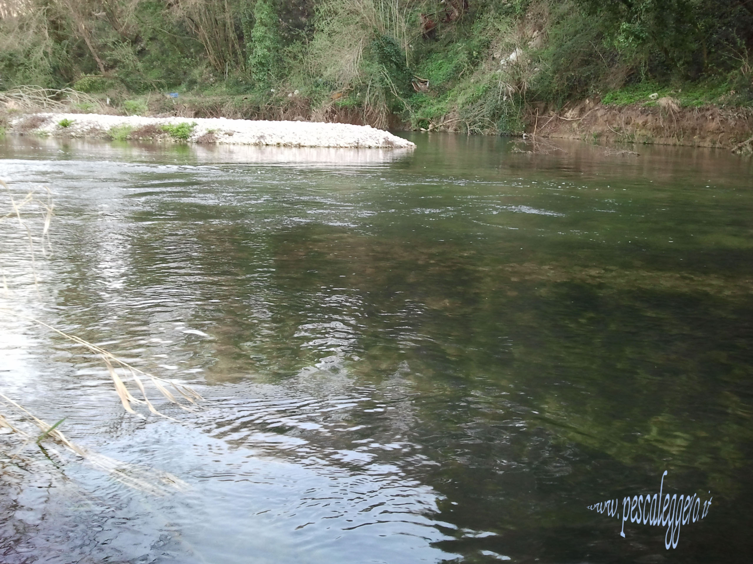 la luce è forte e nelle zone scoperte il sole picchia..... i lanci si susseguono, ma si vedono solo pesci che corrono dietro all'artificiale.... ma niente di più....... piano piano l'acqua sale..... e il sole scende..... come la temperatura...rinfresca le cose cambiano...... sulla sponda opposta nei punti che sono raggiungibili qualcuno cala piombi o tappi..... e qualcuno ha la sacchetta al collo.... Mi sposto e i spostamenti devono per forza di cose tener conto degli altri pescatori.... mi metto in un punto molto bello dove l'acqua corre sulla sponda rallenta nel centro del torrente dove diventa più fonda...... lanci difronte a me l'artificiale passa dentro la buca e riesce bello bello.... è tutto il pomeriggio che fa cosi......